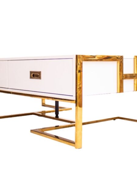 A gleaming gold accent frame complements the TV Stand’s sleek white finish, creating a touch of